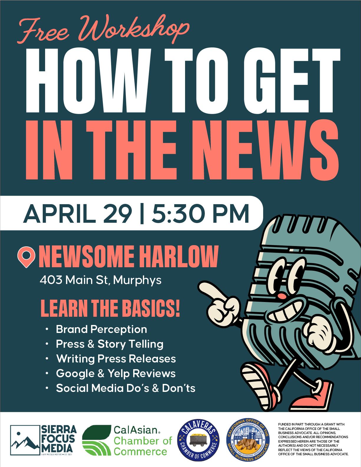 Join us for a free Public Relations workshop on April 29 at 5:30 PM at Newsome Harlow in Murphys. We’ll cover press, public image, press releases, reviews, and social media basics.